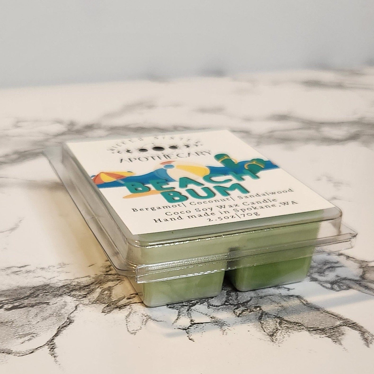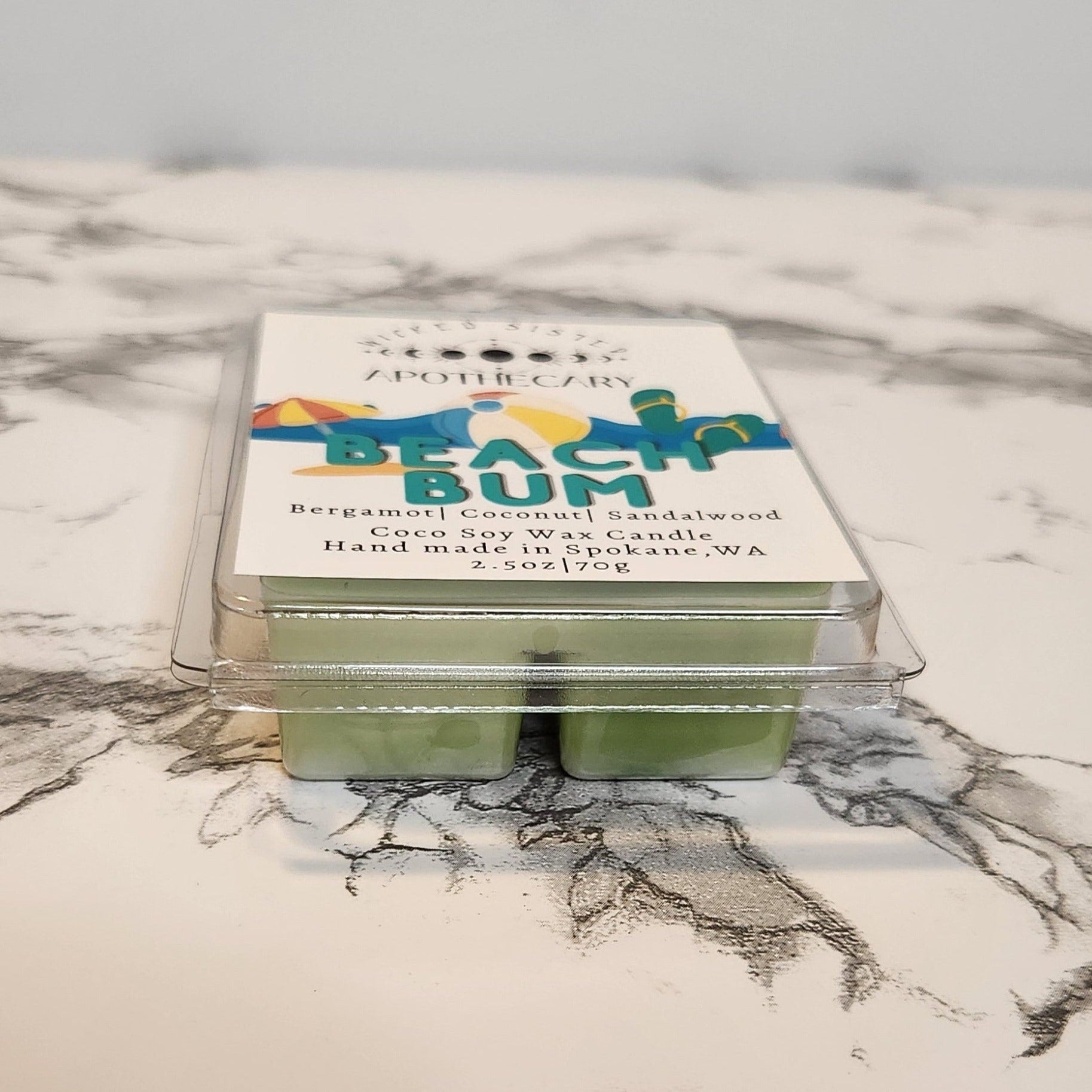 Beach Bum wax melt. Scent notes include bergamot, coconut and sandalwood.