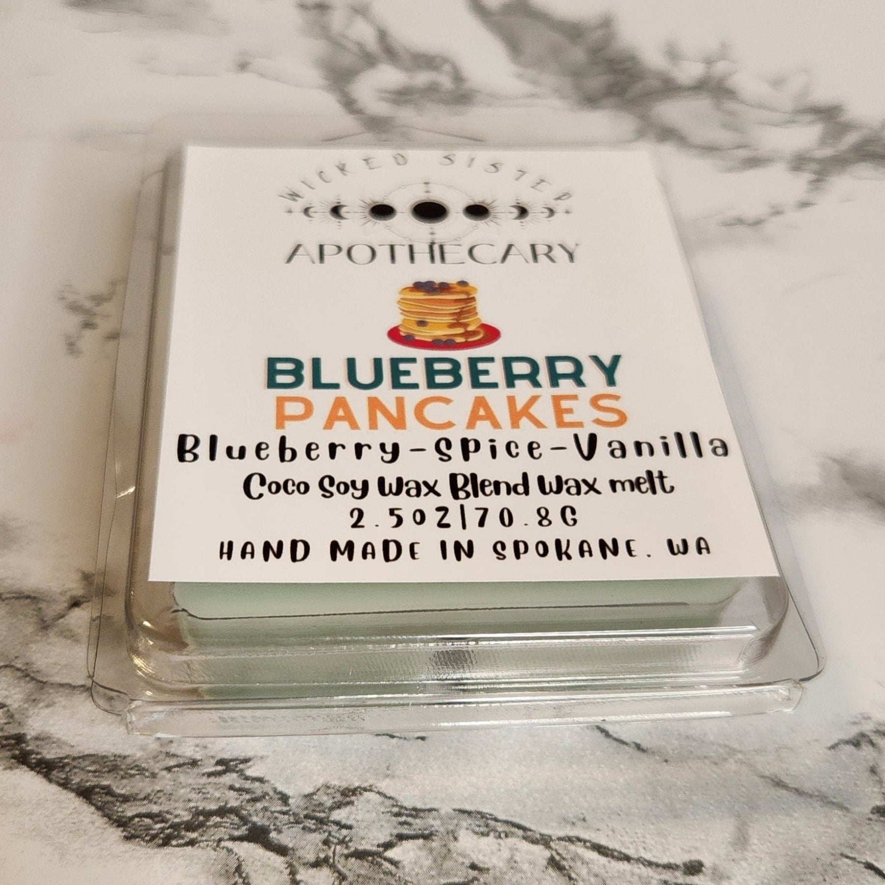 Blueberry Pancakes wax melt. Scent notes include blueberry, spice and vanilla. Made with coconut soy wax.