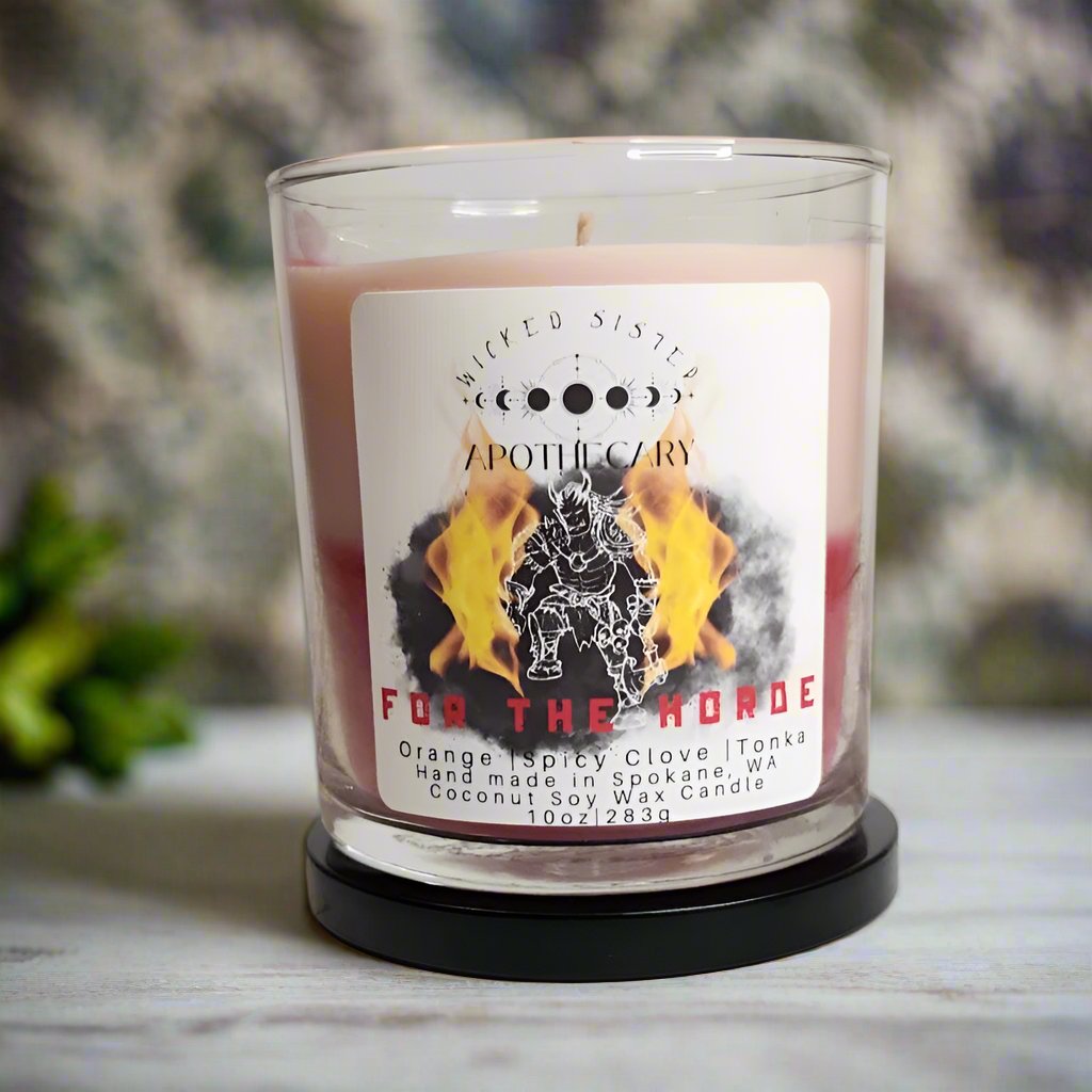 Indulge in the scent of FOR THE HORDE Coconut Soy Wax Candle. Inspired by the world of warcraft faction, this candle features notes of orange, spicy clove and tonka. Enhance your relaxation and immerse yourself in the world of warcraft with this unique and invigorating scent blend.